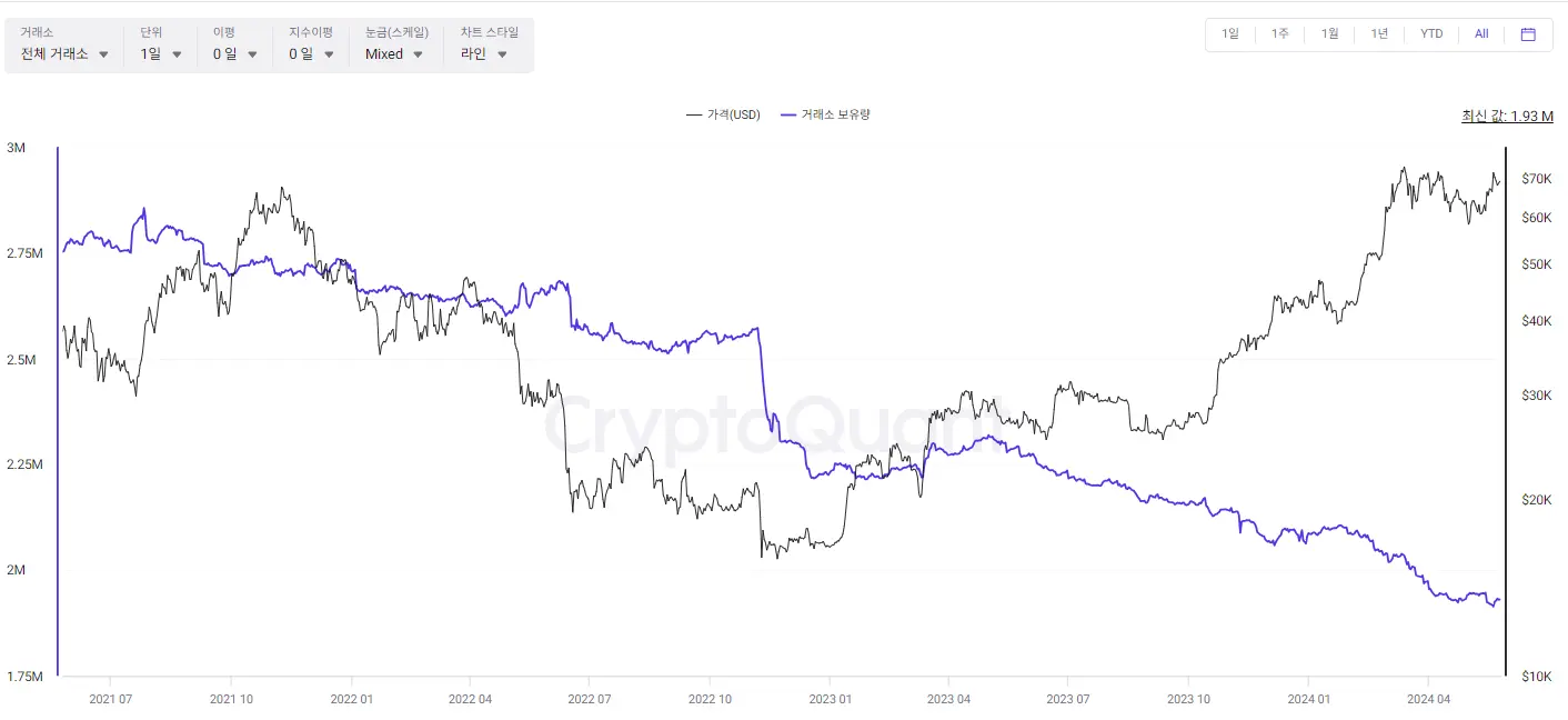 그렇다면 결국 가치는 사람들이 만들어 내는 것이다. 많은 사람들이 좋다고 믿고 소유하고 싶다는 욕구를 불러일으키는 것은 가치를 가지게 된다. 아래 표는 비트코인의 거래소 보유량이다. 비트코인은 개인 디지털 지갑에서도 많이 보관하고 있지만 거래소에서도 매물이 꾸준히 나오게 되는데 전반적으로 꾸준히 감소하는 것을 알 수 있다. 사람들이 신뢰하고 수요가 늘어나고 있는 것이다.