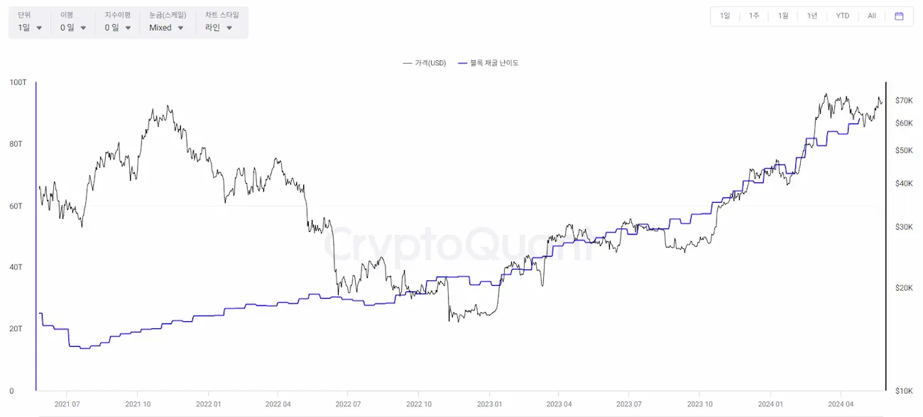 게다가 비트코인은 발행량 한정과 더불어 채굴되는 양도 4년마다 반으로 감소하는 반감기라는 것이 존재한다. 2024년 5월 현재 1,900만개 이상이 채굴되었지만 채굴되는 난이도는 점점 올라가서 공급이 점점 줄어들게 설계되어 있다.